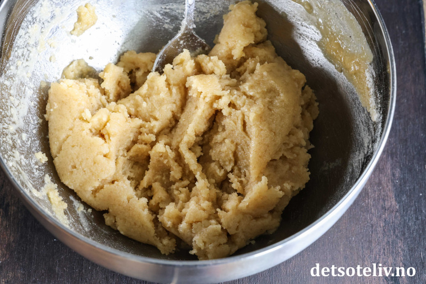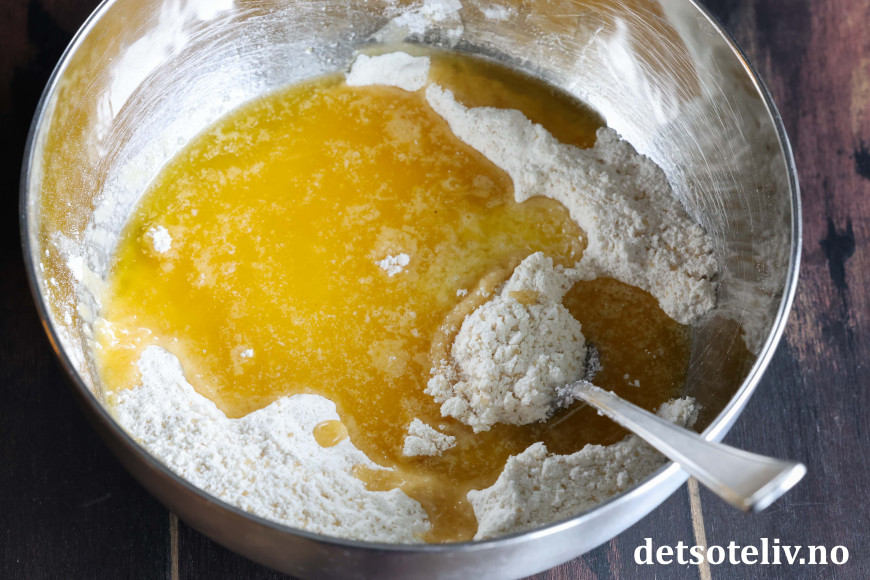 Tilsett smeltet smør og bland sammen til en bløt deig.