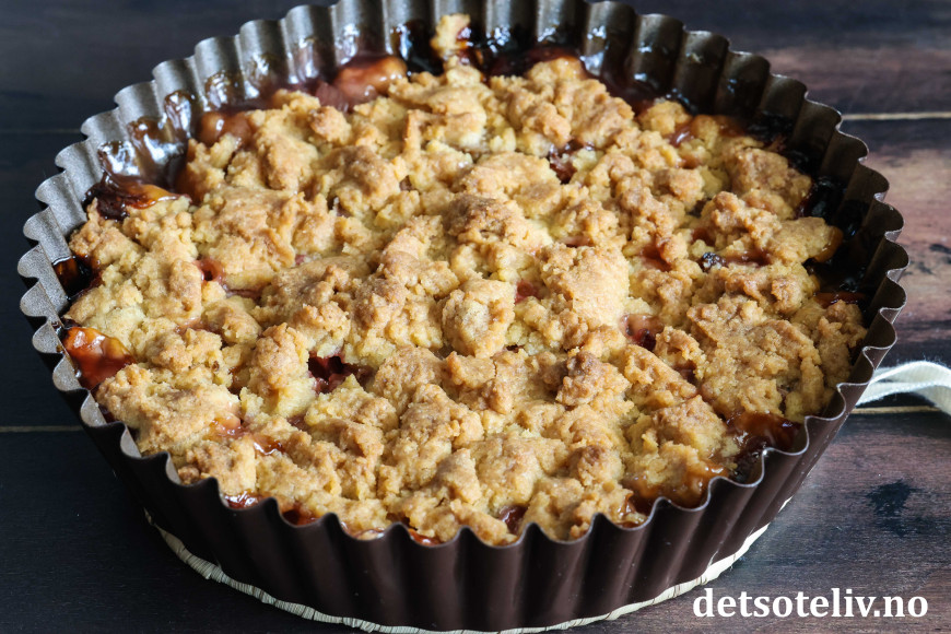 Til smuldredeigen blandes mel, hvitt og brunt sukker og vaniljesukker. Tilsett smeltet smør og bland sammen til en bløt deig.