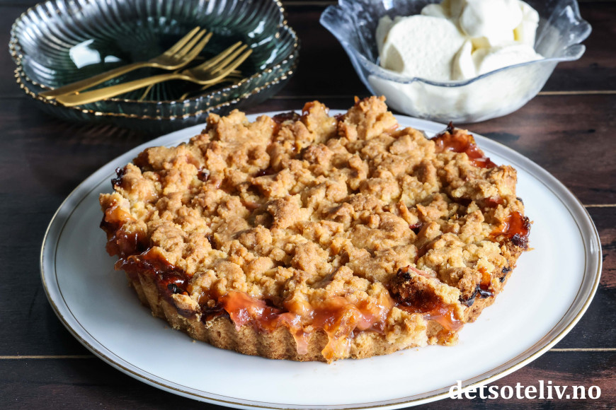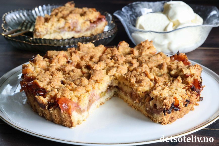 Denne varianten består av mørdeigsbunn, nydelig rabarbrafyll og en smuldredeig på toppen som gir paien god smak og et rustikk utseende.