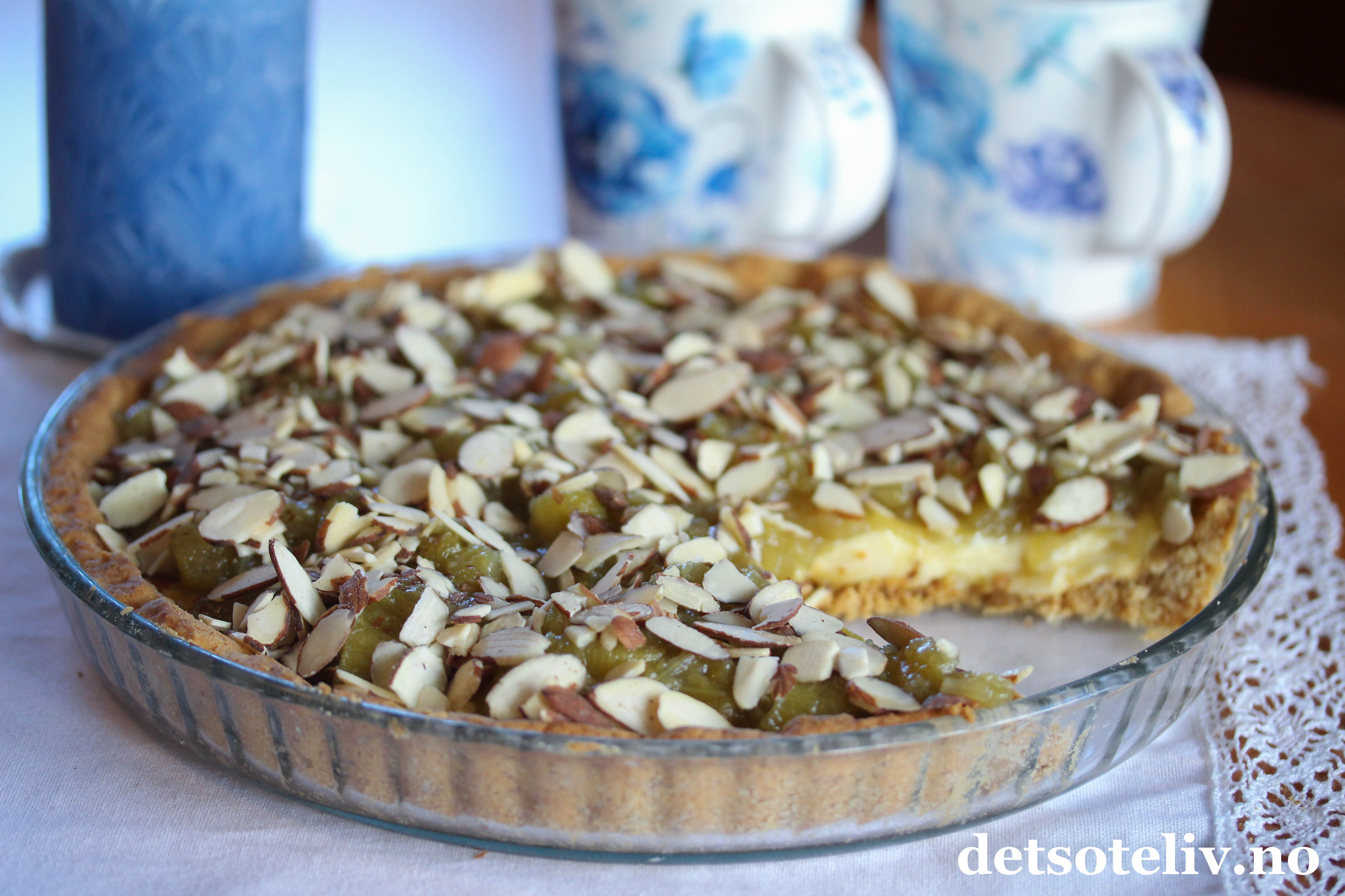 Kaken består av en paibunn som inneholder malte mandler, og et deilig fyll av søt rabarbrakompott og vaniljekrem. På toppen er kaken dekket med masse mandelflarn.