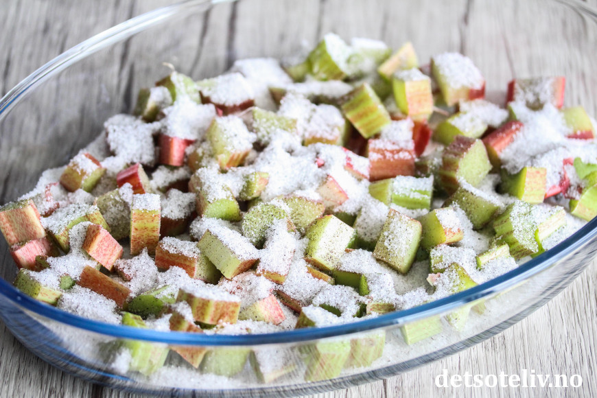 Del rabarbra i mindre biter og ha dem i en ildfast form.