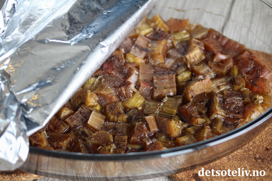 Bak rabarbraen midt i ovnen ved 180 °C i ca. 40 minutter.