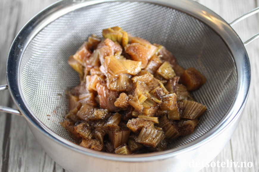 Ha den bakte rabarbraen i en sil over en bolle. Press godt med en skje slik at saften renner av.