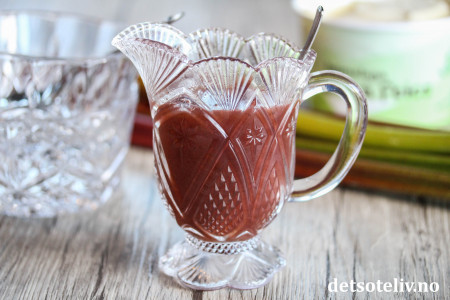Hell den søte rabarbrasausen i en kanne og sett i kjøleskapet.