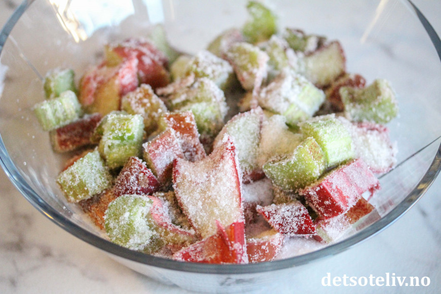 Del renset rabarbra i mindre biter. Ha bitene i en skål sammen med sukkeret. Rør slik at alle rabarbrabitene blir godt dekket av sukker.