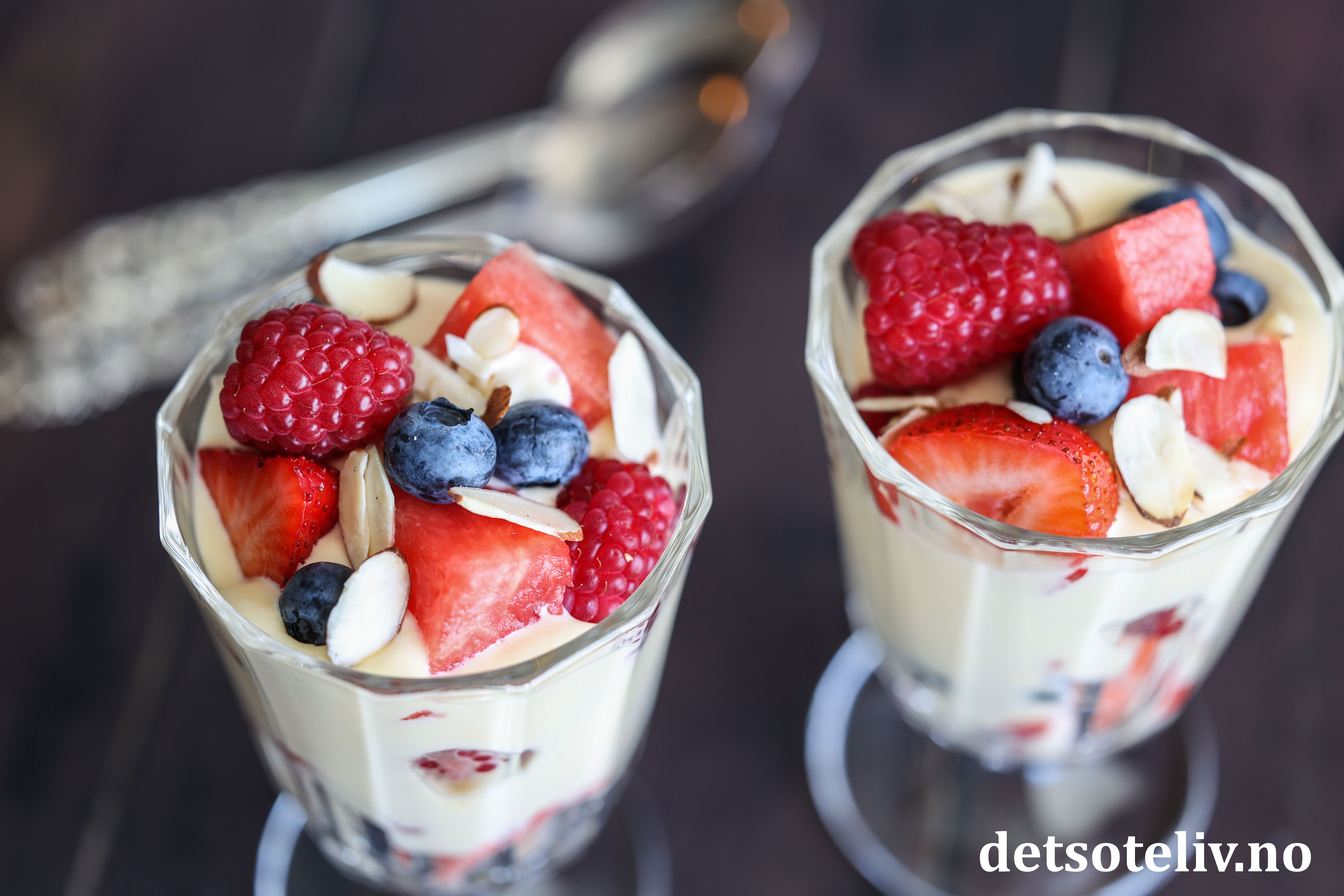 Legg bær og vannmelon lagvis med råkrem. Dryss mandelflak på toppen til pynt hvis du vil.