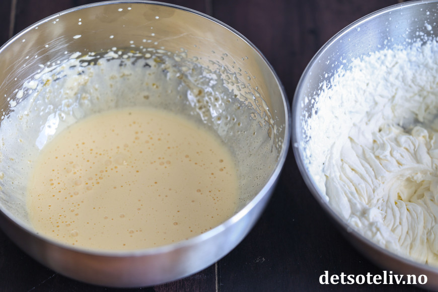 Pisk eggeplommer og sukker til tykk og luftig eggedosis (blandingen blir tykkere enn vanlig eggedosis siden du her bare bruker eggeplommene).