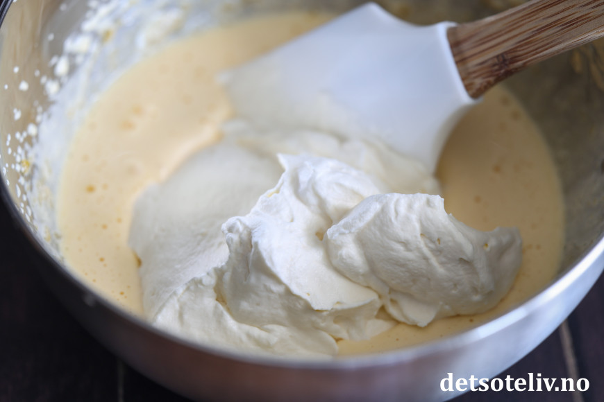 Vend eggedosisen forsiktig i den piskede kremen så alt blir godt blandet.