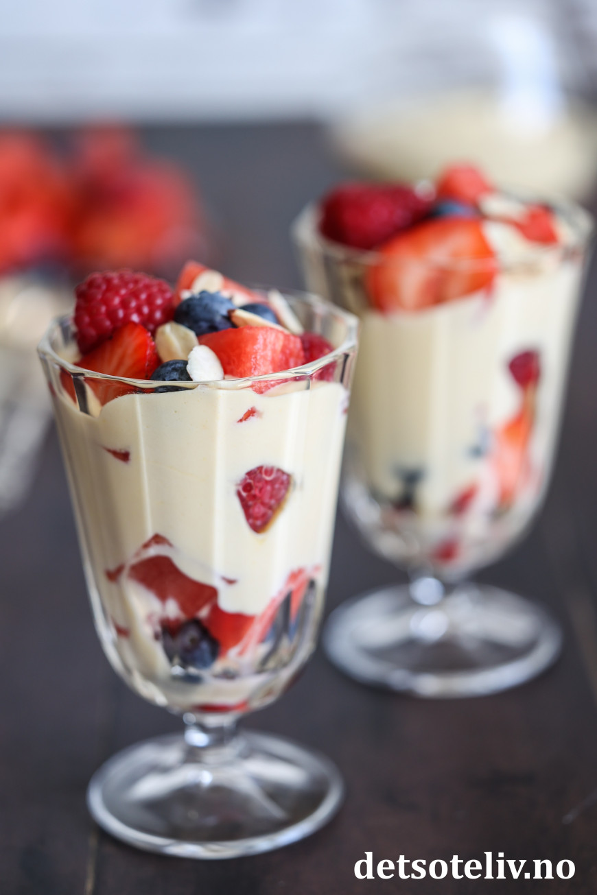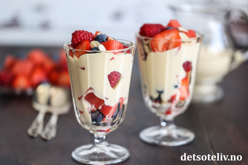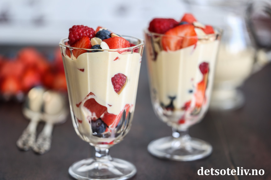 ♥ Desserten bør serveres samme dag den er laget, så både bær og råkremen er helt fersk.