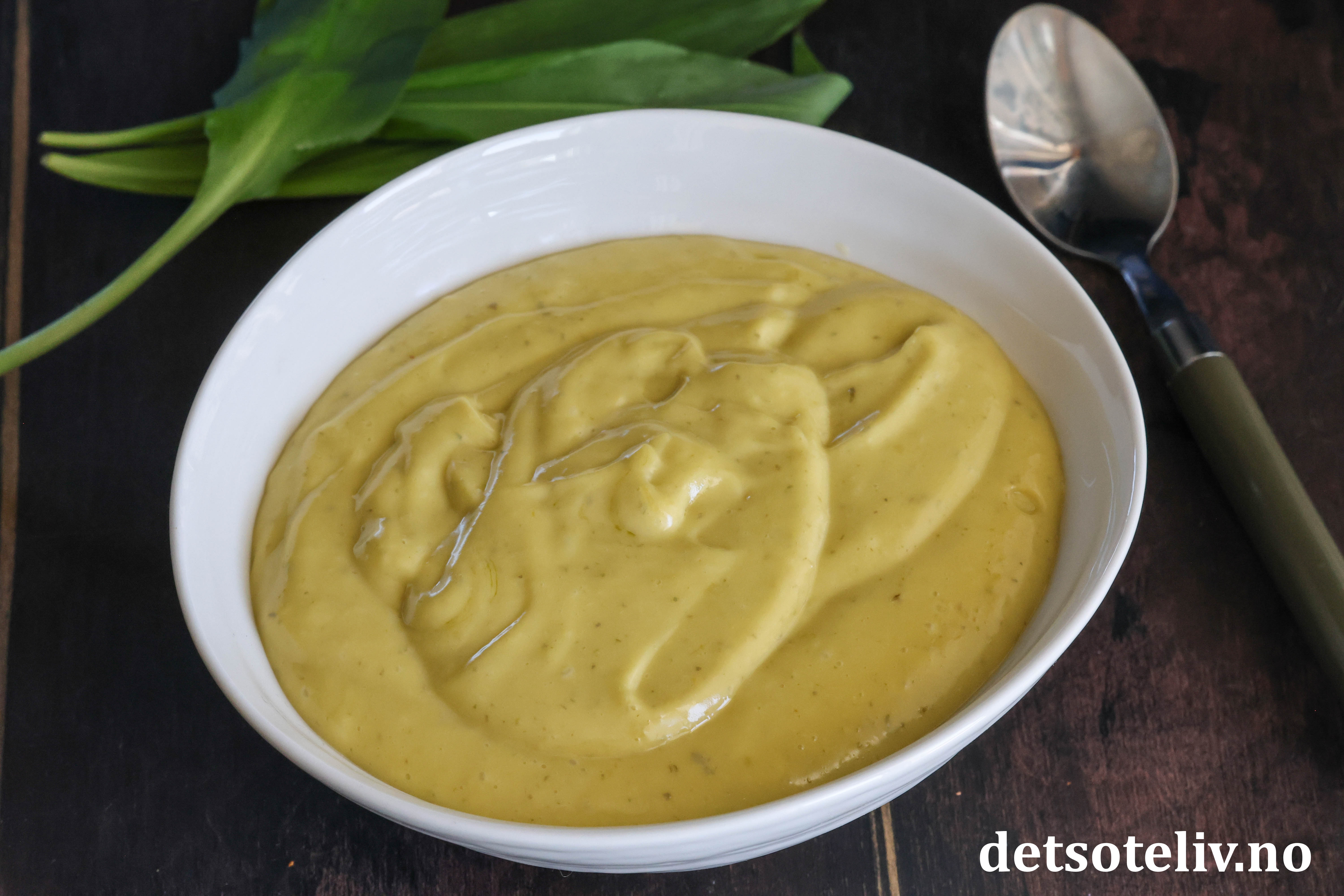 Tilsett resten av ramsløkpuréen og pisk videre. Smak til sausen med kvernet salt og hvit pepper og eventuelt litt mer ramsløkpuré og/eller sitronsaft.