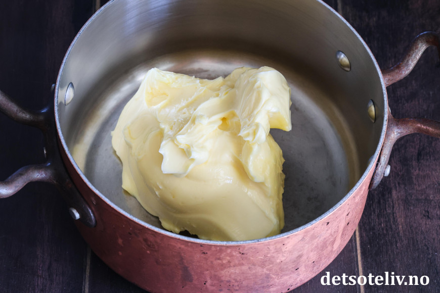 Løft bollen bort fra vanndampen. Spe så litt og litt med det klarnede smøret. Hell forsiktig fra kjelen så du ikke får med deg melkestoffene som ligger i bunnen av kjelen.