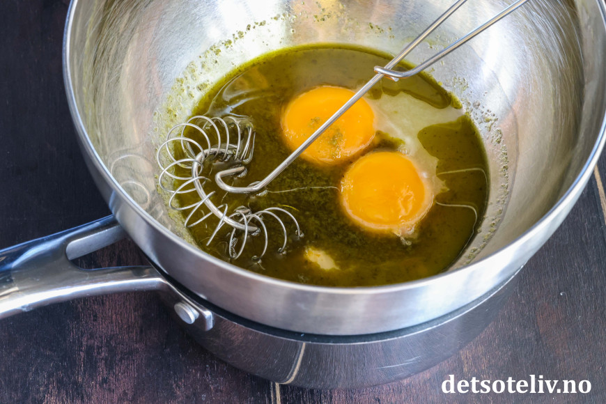 ♥ Merk at det smeltede, klarnede smøret skal piskes gradvis inn i eggemassen. Tilsett litt og pisk kraftig, og se at smøret har blitt godt inkorporert i sausen før du sper med litt mer.