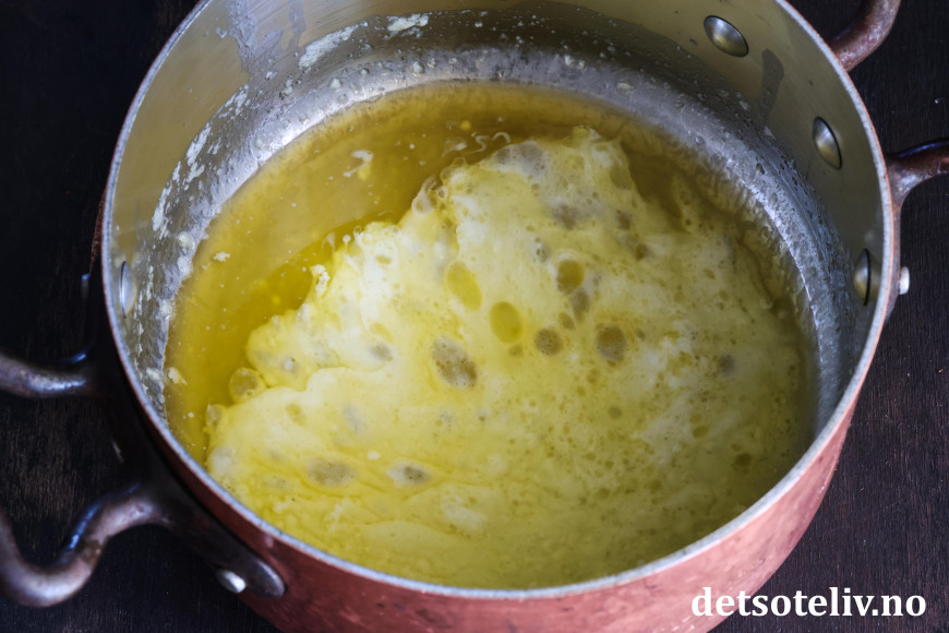 La det smelte på middels varme uten å røre i det. Ta kjelen av platen og la smøret stå i ro i noen minutter. De hvite melkestoffene i smøret vil da synke til bunnen av kjelen. Det er kun det gule smøret (uten det hvite i bunnen av kjelen) som skal brukes i sausen.