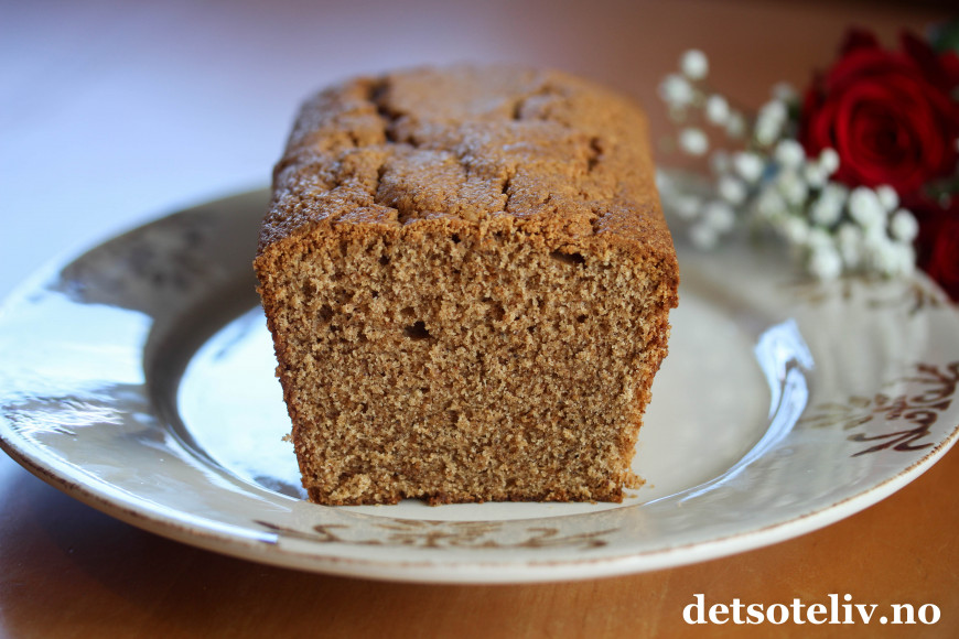 Ha deigen i en smurt form som rommer 1 liter (ha bakepapir i bunnen). Stek kaken nederst i ovnen ved 200°C i ca 45 min (sjekk med kakenål at kaken er gjennomstekt). Avkjøl kaken litt i formen før den hvelves ut. Fjern bakepapiret og avkjøl helt på rist.