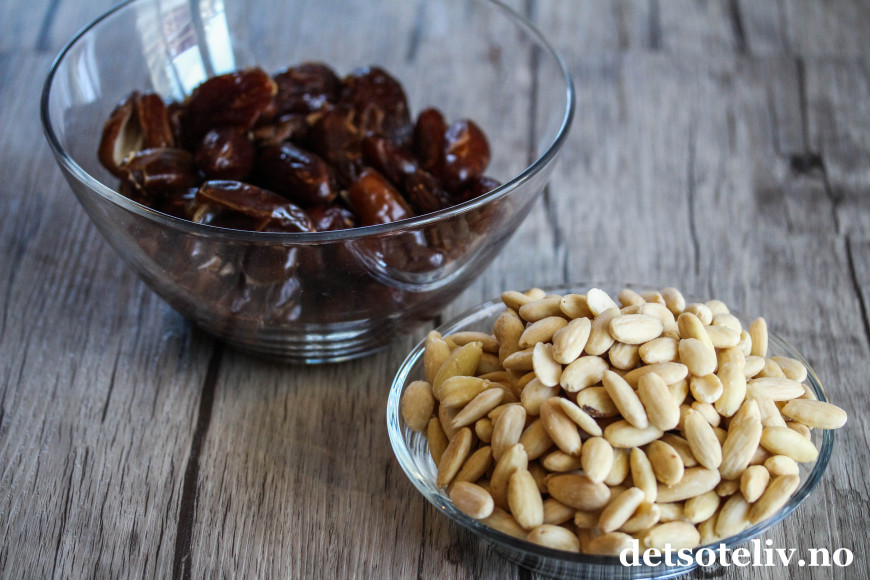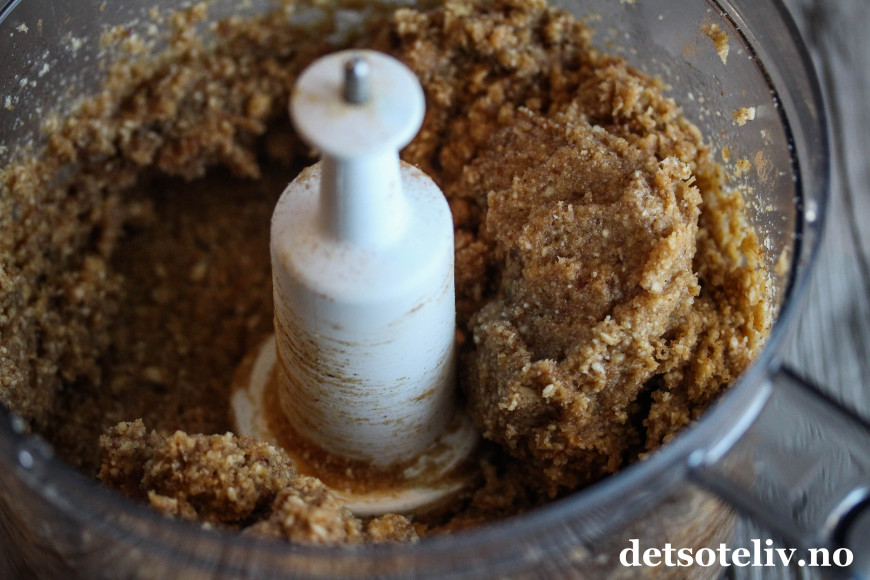 Tilsett dadlene, lønnesirup og krydder og kjør blandingen sammen en god stund slik at du får en jevn masse. Skrap ned innholdet fra kantene av food processoren innimellom slik at du får med deg alt.