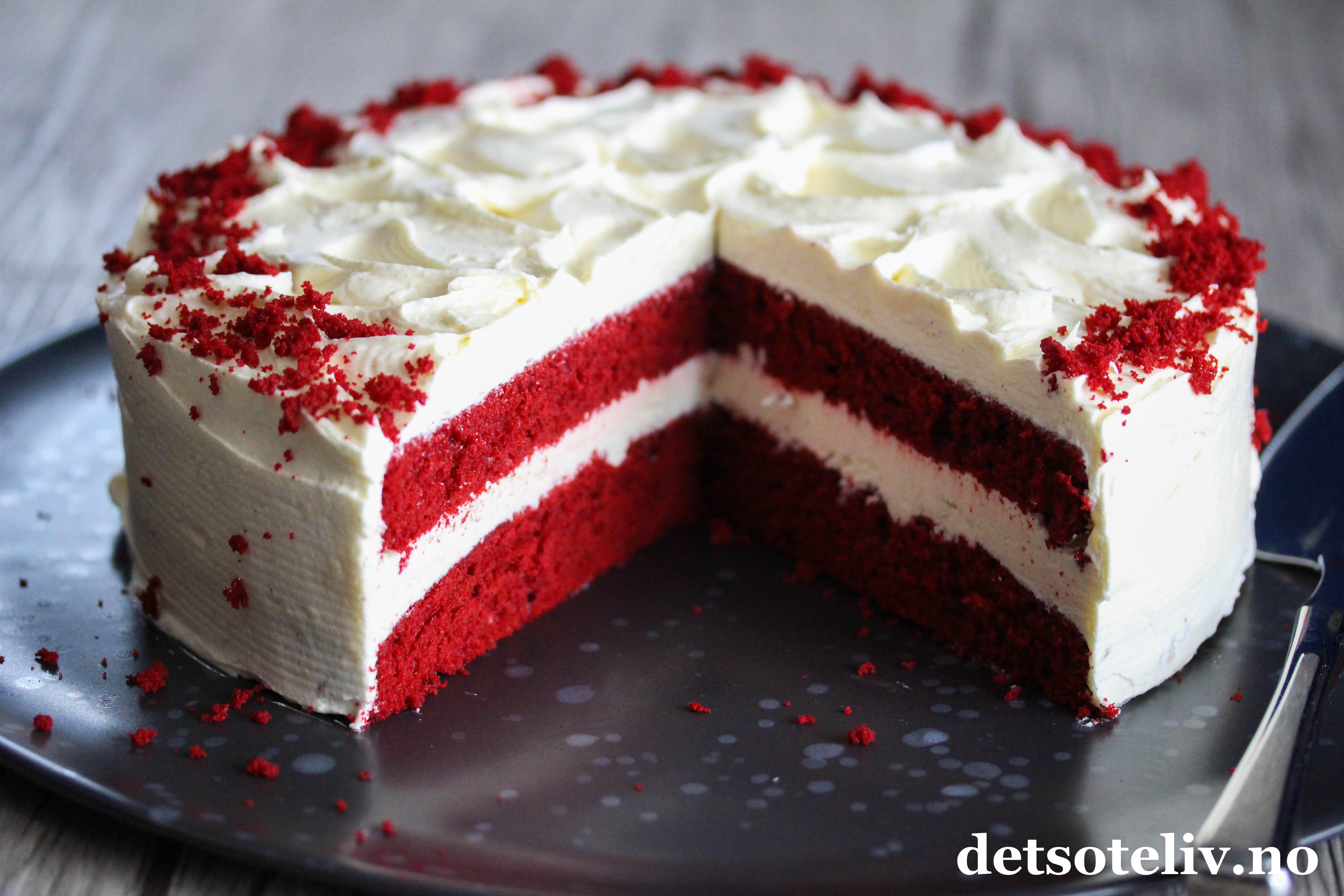 Kaken er pr def en sjokoladekake, men inneholder så mye rød konditorfarge at den blir rød i fargen. Kaken fylles med lekker, hvit smørkrem, som står i spennende kontrast til fargen på kakebunnene.