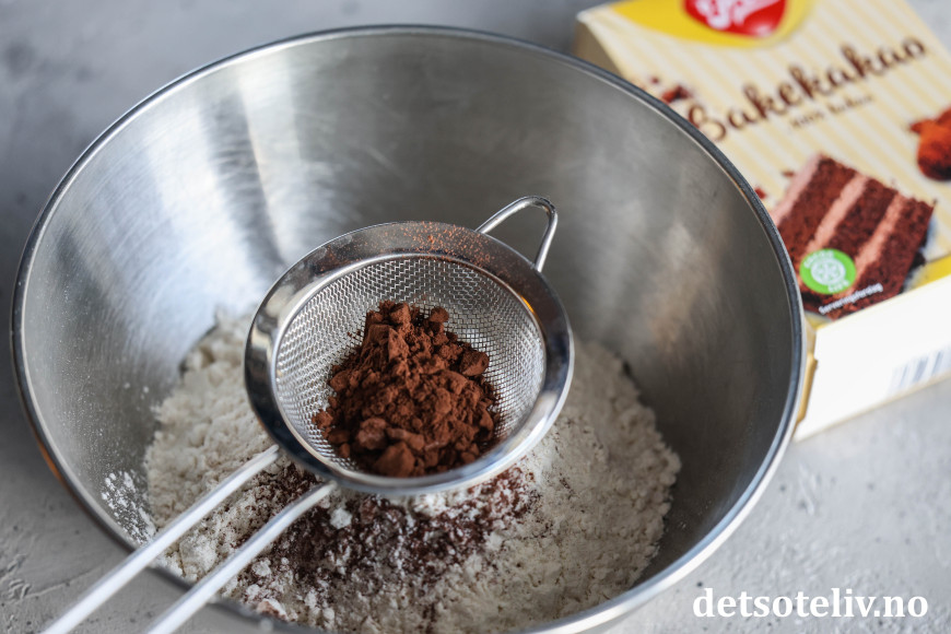 Sikt kakaopulveret sammen med hvetemelet. Bland dette inn til du får en glatt og klumpfri deig (bruk gjerne elektrisk håndmikser i et par minutter). Pisk inn den røde konditorfargen (kakedeigen blir da kraftig rødfarget i fargen).