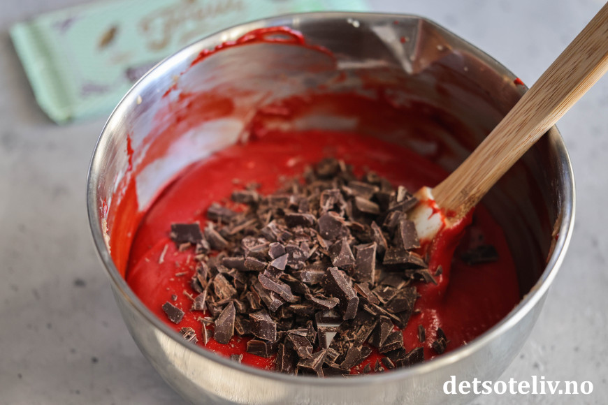 Hakk Freia Dronningsjokolade. Vend sjokoladebitene inn i deigen.