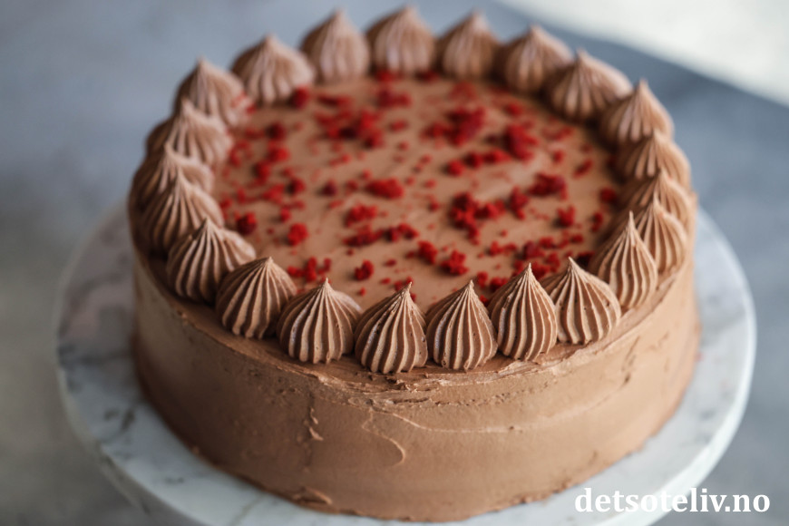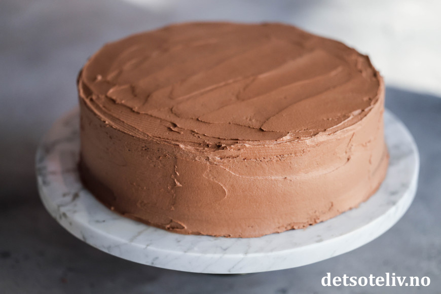 Dekk hele kaken med sjokoladekrem. Pynt kaken med sprøytede sjokoladekremtopper.