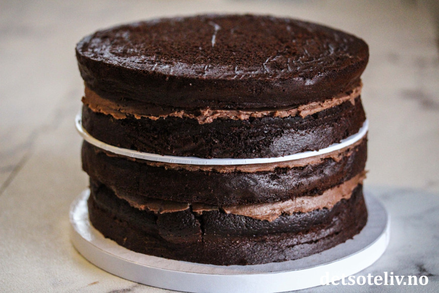 Ha sjokoladekrem på bunnen og dekk med den neste kakebunnen. Smør på mer sjokoladekrem.