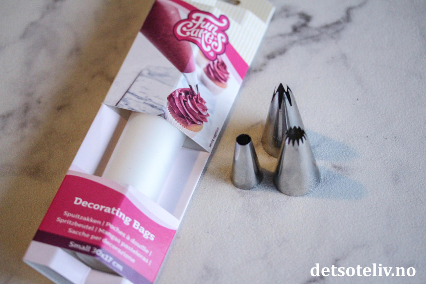 ♥ Mine favoritt-sprøyteposer er sprøyteposene til Funcakes. Sprøytetippene jeg brukte er Wilton 1M, Wilton 4B og standard rund tipp 12.
