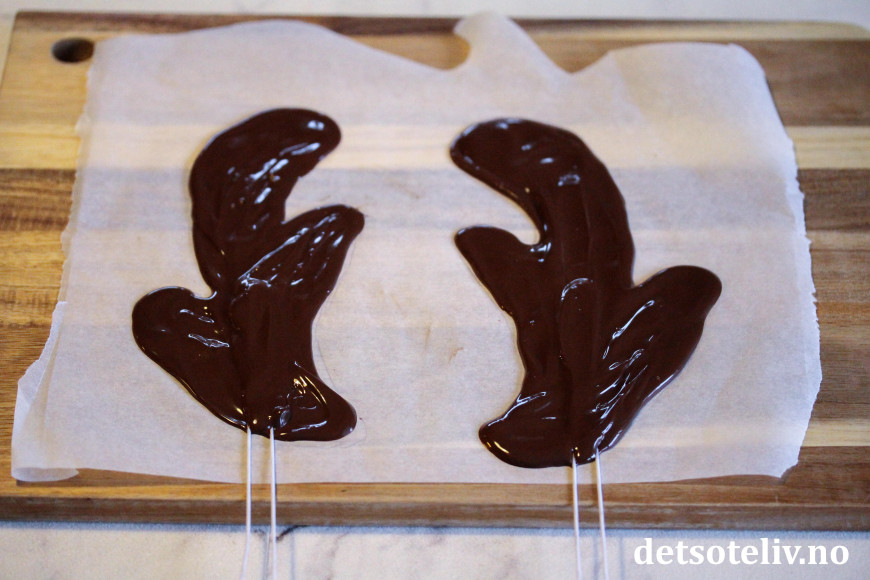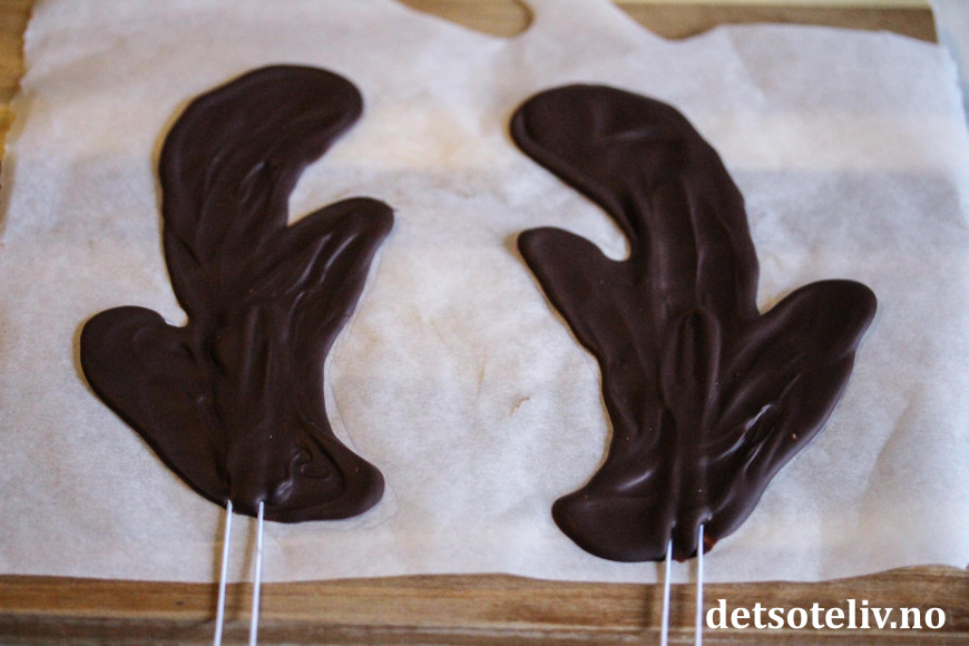 Finn frem to blomsterwire (se tips) og bøy dem på midten (så de ikke blir for lange). Legg den bøyde enden av hver wire på den nedre enden av hvert horn, og ha over mer smeltet sjokolade slik at de blir helt dekket av sjokolade.