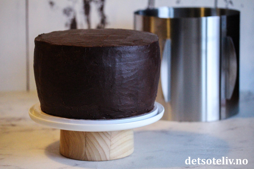 ♥ Det trengs en del sjokoladekrem til denne kaken. Jeg smører først på et lag slik at kaken blir dekket og setter kaken i kjøleskapet til kremen har stivnet. Så legger jeg på et nytt lag som jeg jevner til med en palettkniv og en smoother.