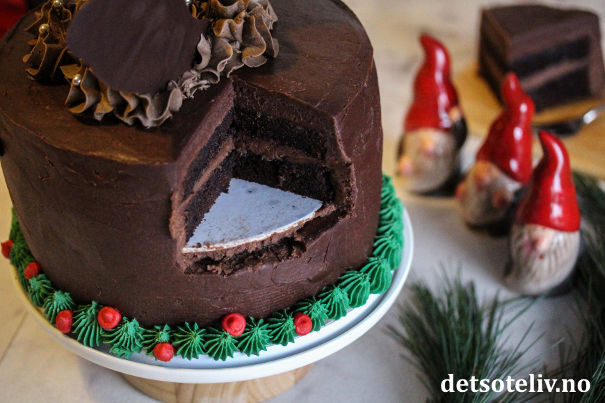 Selve kaken er en supersaftig sjokoladekake som fylles med deilig sjokoladekrem. Pynten er laget av fondant og kokesjokolade.