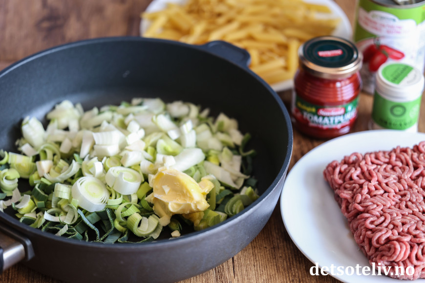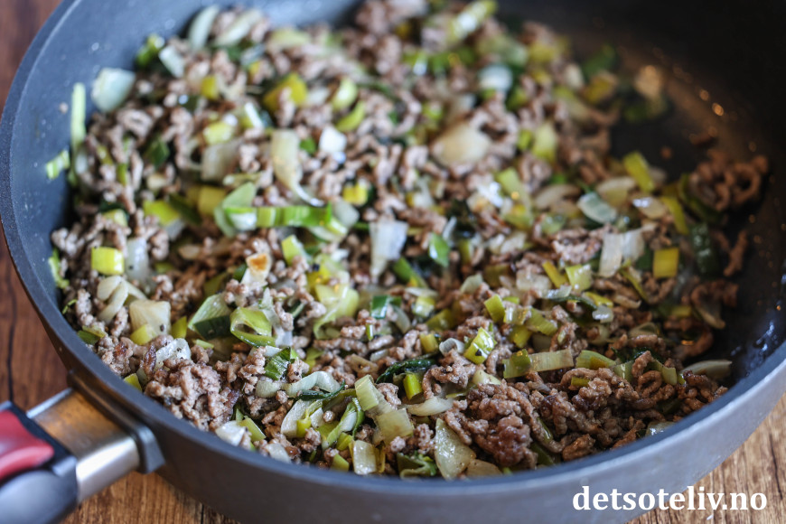 Tilsett kjøttdeigen og stek den sammen med purreløken til den er gjennomstekt.