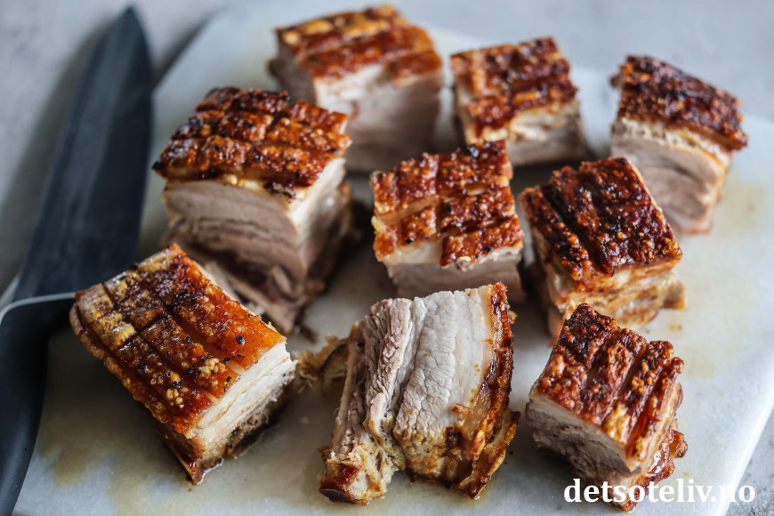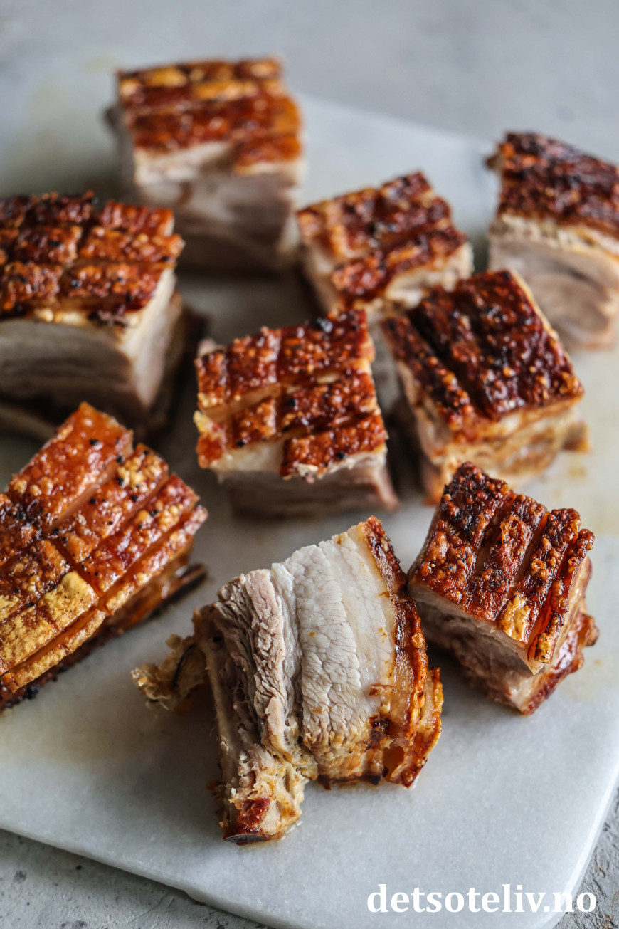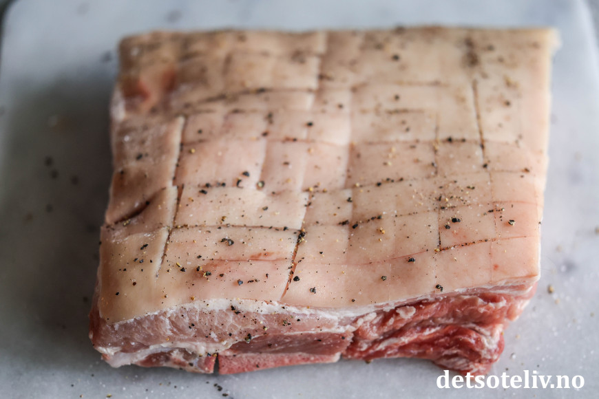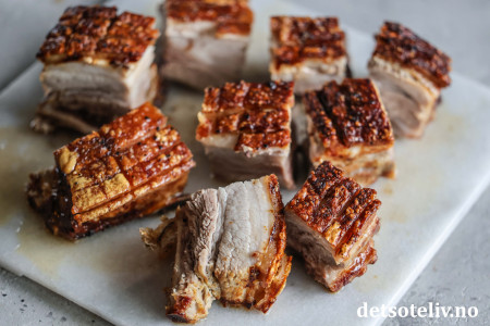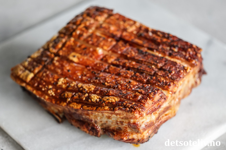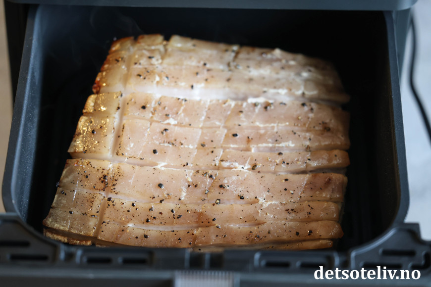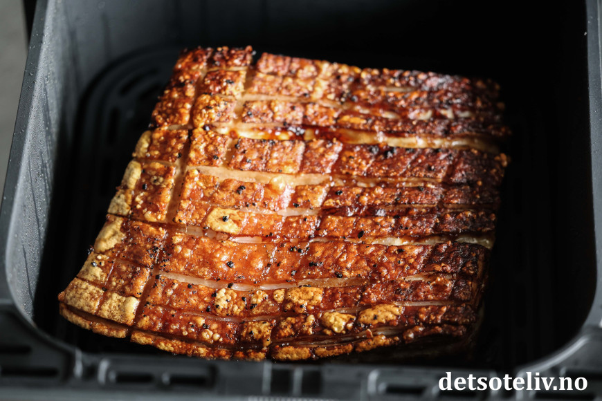 ♥ Steketid avhenger noe av tykkelsen på ribben og også på styrken på airfryeren du har, for airfryere er litt forskjellige. Jeg liker at ribben er godt stekt, derfor lar jeg den steke med svoren ned i 45 minutter på 175°C. Dette bør gå fint i alle airfryere. Deretter steker jeg den med svoren vendende opp ved 200°C i 30 minutter, men her må du følge med på ribben og sjekke allerede etter 15 - 20 minutter, slik at svoren ikke blir brent. Ved noen airfryere kan det være hensiktsmessig å redusere temperaturen fra 200 grader til 180 grader.