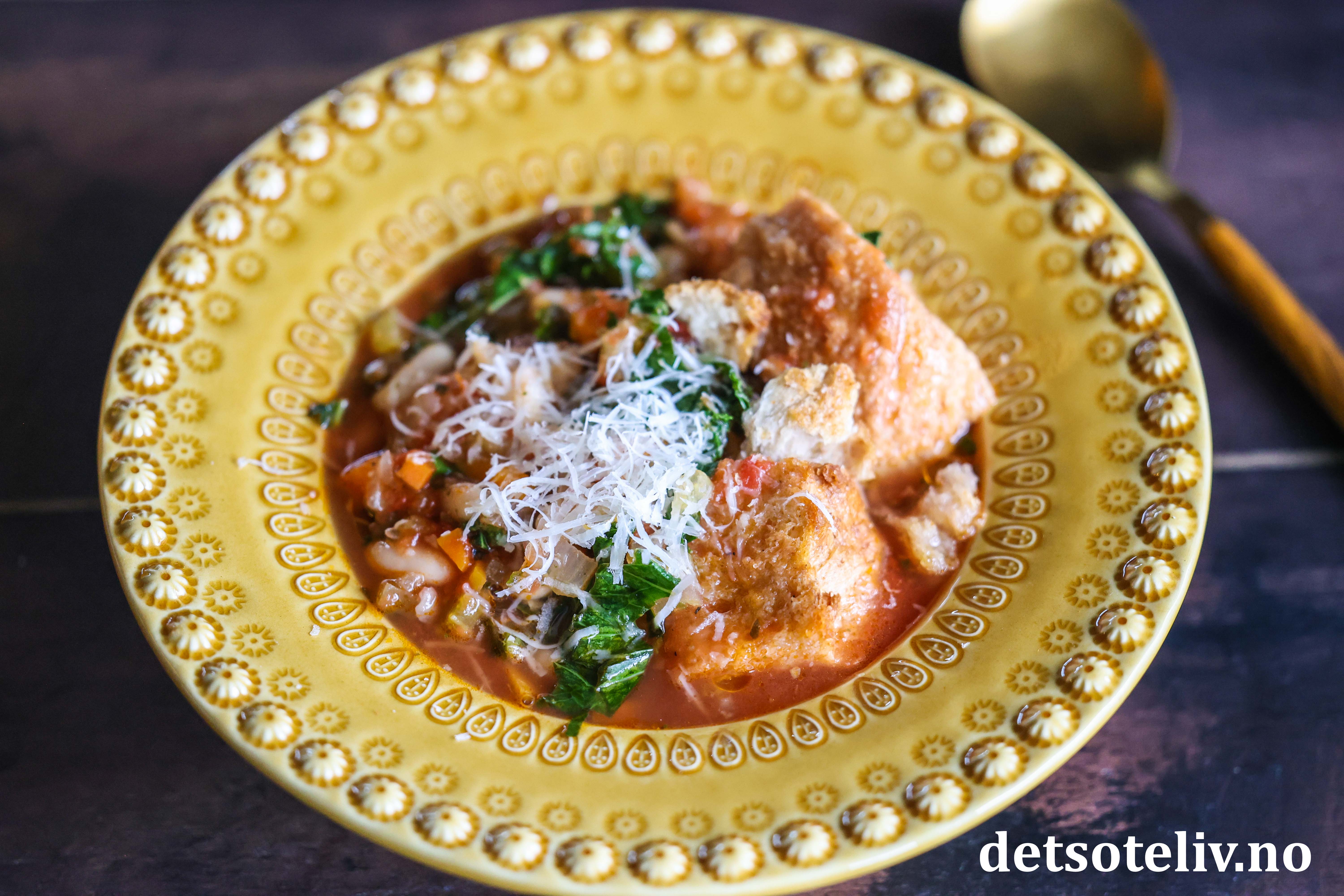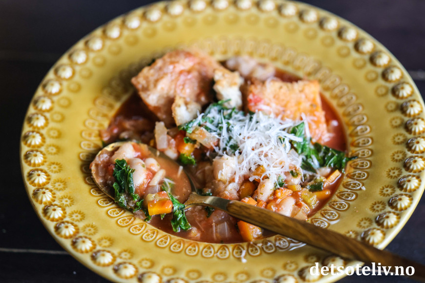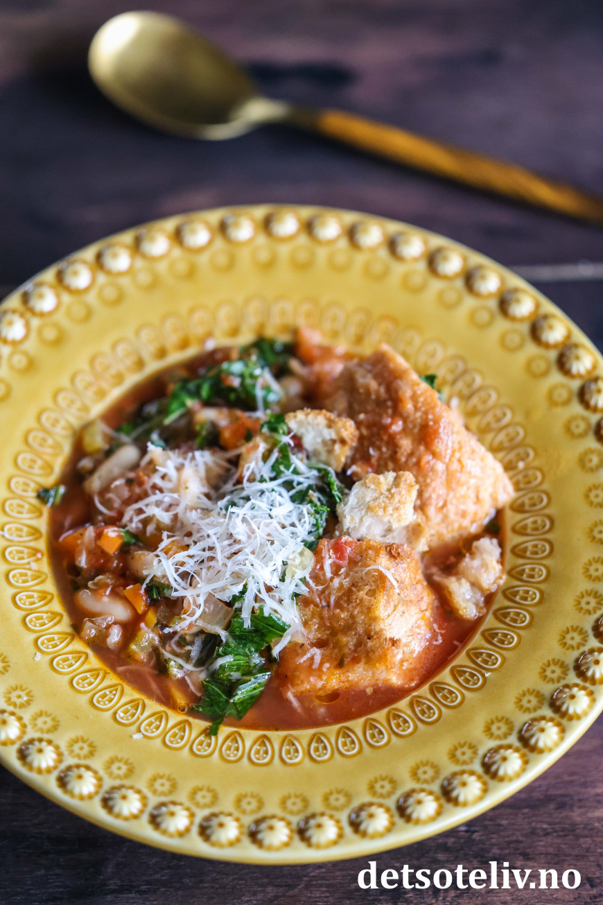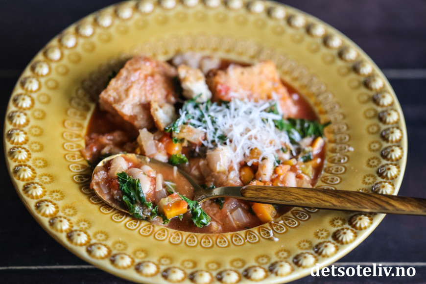 Da jeg var i Firenze tidligere i høst, testet jeg denne suppen på flere restauranter, og fikk den servert i litt ulike varianter. Ikke bare var grønnsakene forskjellige, og dermed også fargen på suppen - også konsistensen varierte veldig. Noen var nesten som tykk, varm grøt på grunn av at brødet var kokt sammen med suppen, mens andre var mer flytende og med store brødkrutonger vendt inn i suppen. Personlig likte jeg best sistnevnte variant, og det er slik jeg har laget denne suppen her.