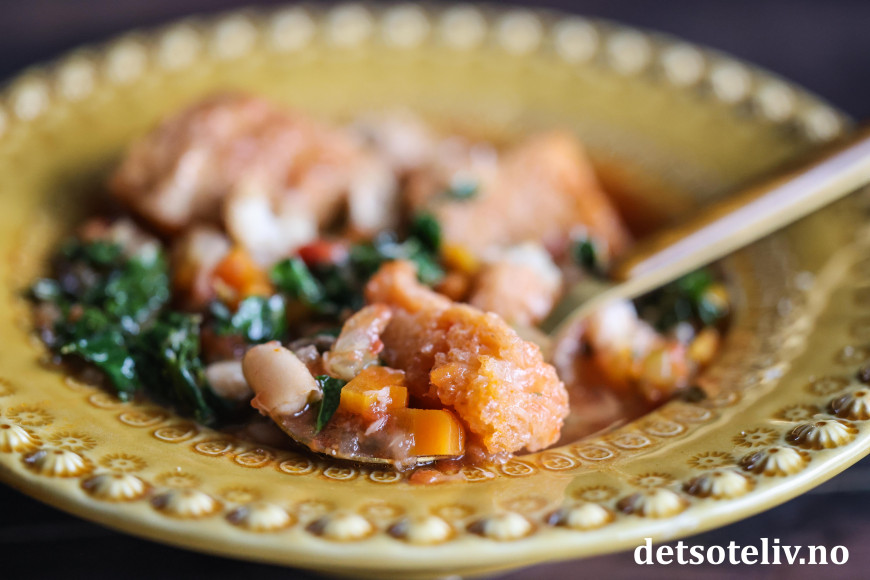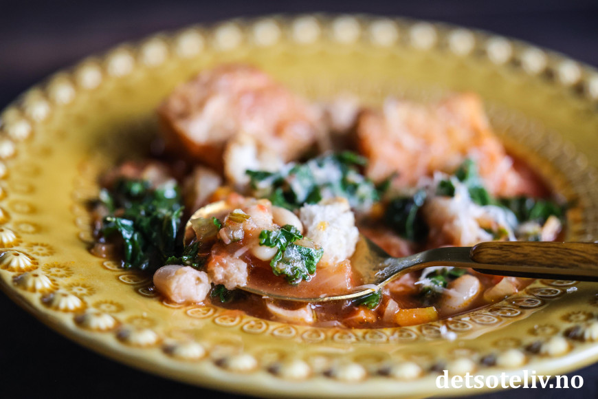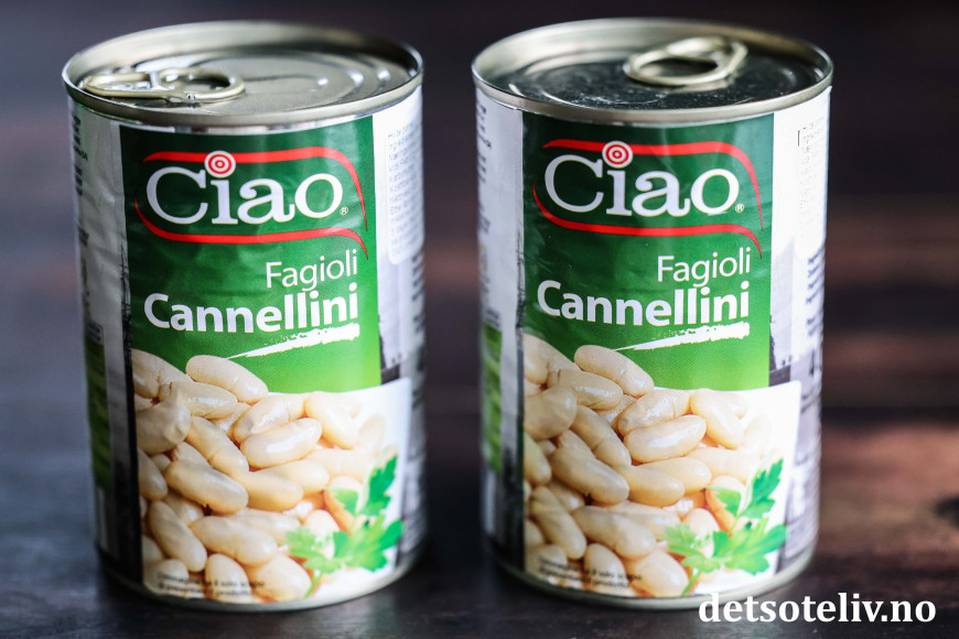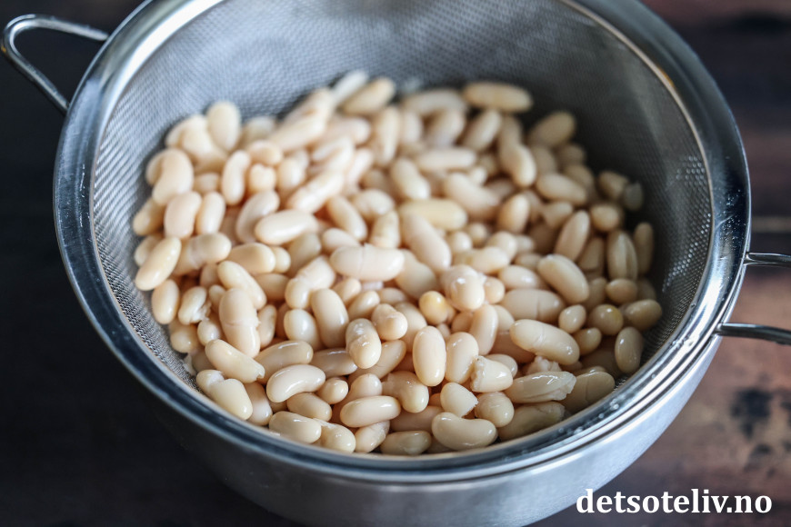 ♥ Jeg har her brukt 2 bokser hermetiske hvite bønner (cannellini-bønner). De trenger bare å gjennomvarmes, så jeg tilsetter dem helt på slutten av koketiden så de ikke skal koke i stykker. Dersom du heller vil bløtlegge tørkede hvite bønner og koke dem for seg, er det ikke noe i veien for det.