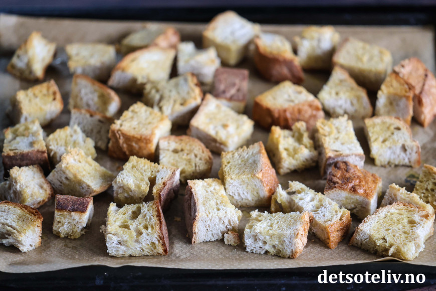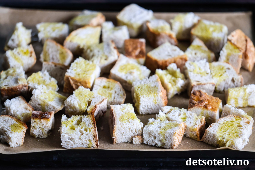 Hvis du bruker tørt brød, kan du kutte det opp i terninger og ha direkte i suppen. Mitt brød var ikke tørt, så jeg skjærte det først i terninger og spredde brødterningene utover en bakepapirdekket stekeplate. Ringle over olivenolje og stek brødterningene midt i ovnen ved 200°C i 10 - 20 minutter (avhengig av hvor store bitene er og hvor tørt brødet er i utgangspunktet).