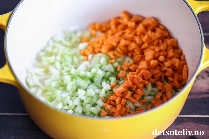 Kutt opp løk, selleristenger og gulrøtter i små terninger (blandingen kalles for soffritto på italiensk).