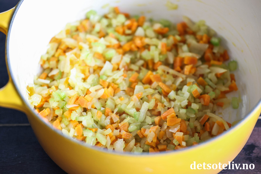 Ha dette i en gryte sammen med olivenolje. Stek på middels varme i ca. 10 minutter, til blandingen blir gyllen og myk.
