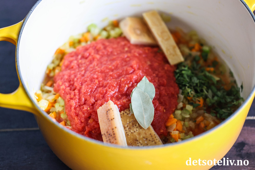 Tilsett hermetiske tomater, grønnsakskraft, hakkede hvitløksfedd, urter og hvitvin. Legg parmesanskalken i gryten (jeg elsker ost og tilsetter som regel flere av dem... 😊).