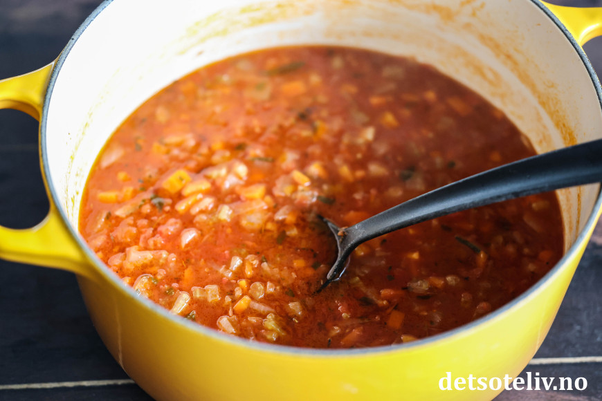 Sett lokk på gryten og varm opp til kokepunktet. La suppen småkoke i ca. 20 minutter.