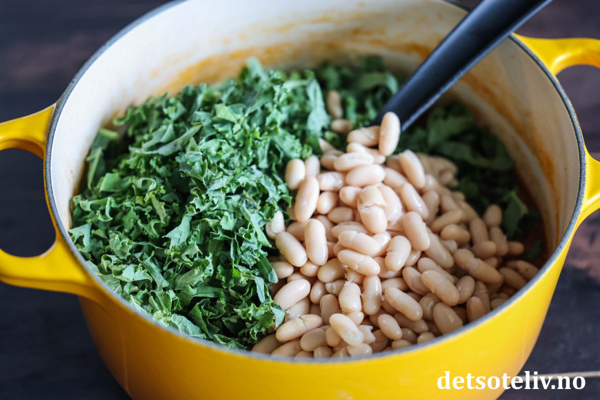 Tilsett fint oppkuttet grønnkål og godt avrente og skylte, hvite bønner.
