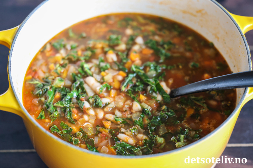 Ta ut parmesanskalk(ene) og laurbærblad. Tilsett fint oppkuttet grønnkål og godt avrente og skylte, hvite bønner.