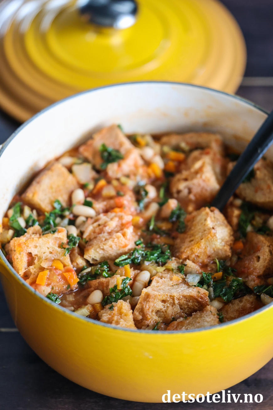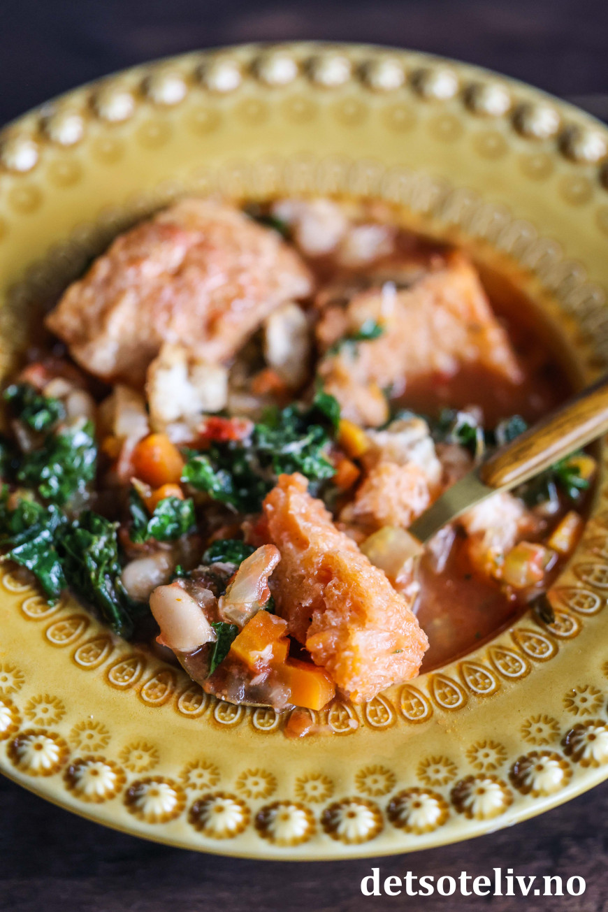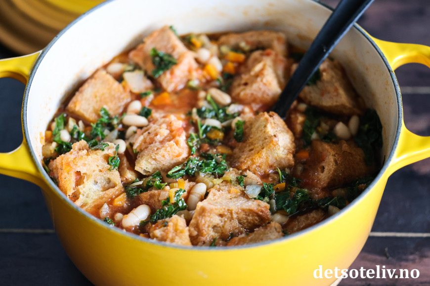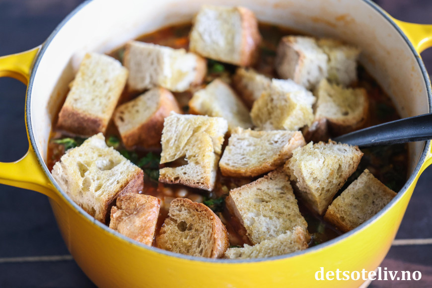 ♥ Som nevnt innledningsvis, vil tykkelsen på Ribollitaen avhenge av hvor mye brød du bruker og hvor lenge du lar brødet koke med suppen. Koker du brødbitene lenge, vil de gå i oppløsning og gjøre suppen skikkelig tykk og grøtaktig. Jeg liker best flytende suppekonsistens, og har derfor brødterningene i suppen helt på slutten av koketiden.