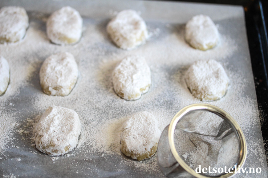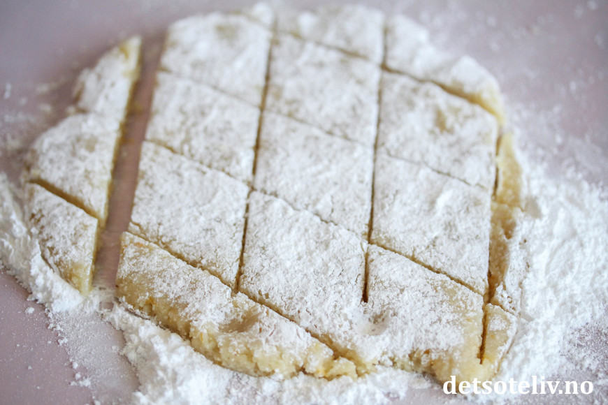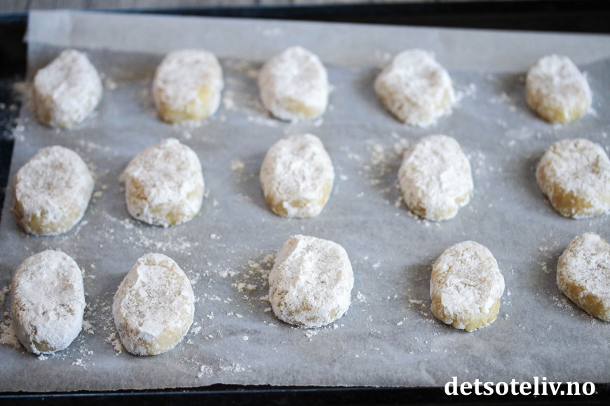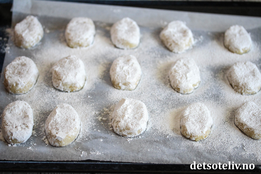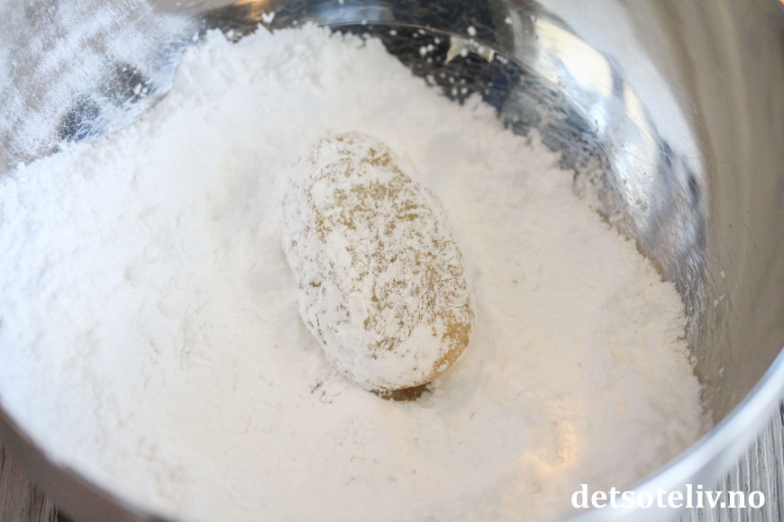 Dagen etter formes deigen til flate, ovale kaker som er ca. 1 cm tykke. Ha godt med melis på hendene dersom deigen er klissete.