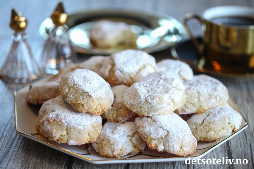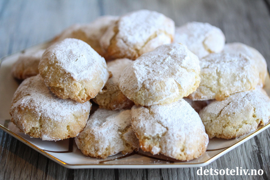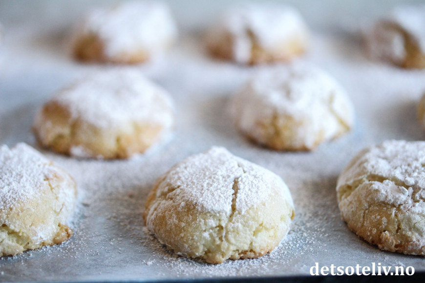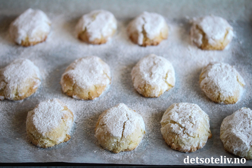 Stek kakene midt i ovnen ved 160 °C i ca. 20 minutter. Kakene skal være lyse og myke også når de er ferdigstekte. La kakene avkjøles på platen til de er faste i konsistensen. Flytt dem deretter over på en rist og avkjøl helt.