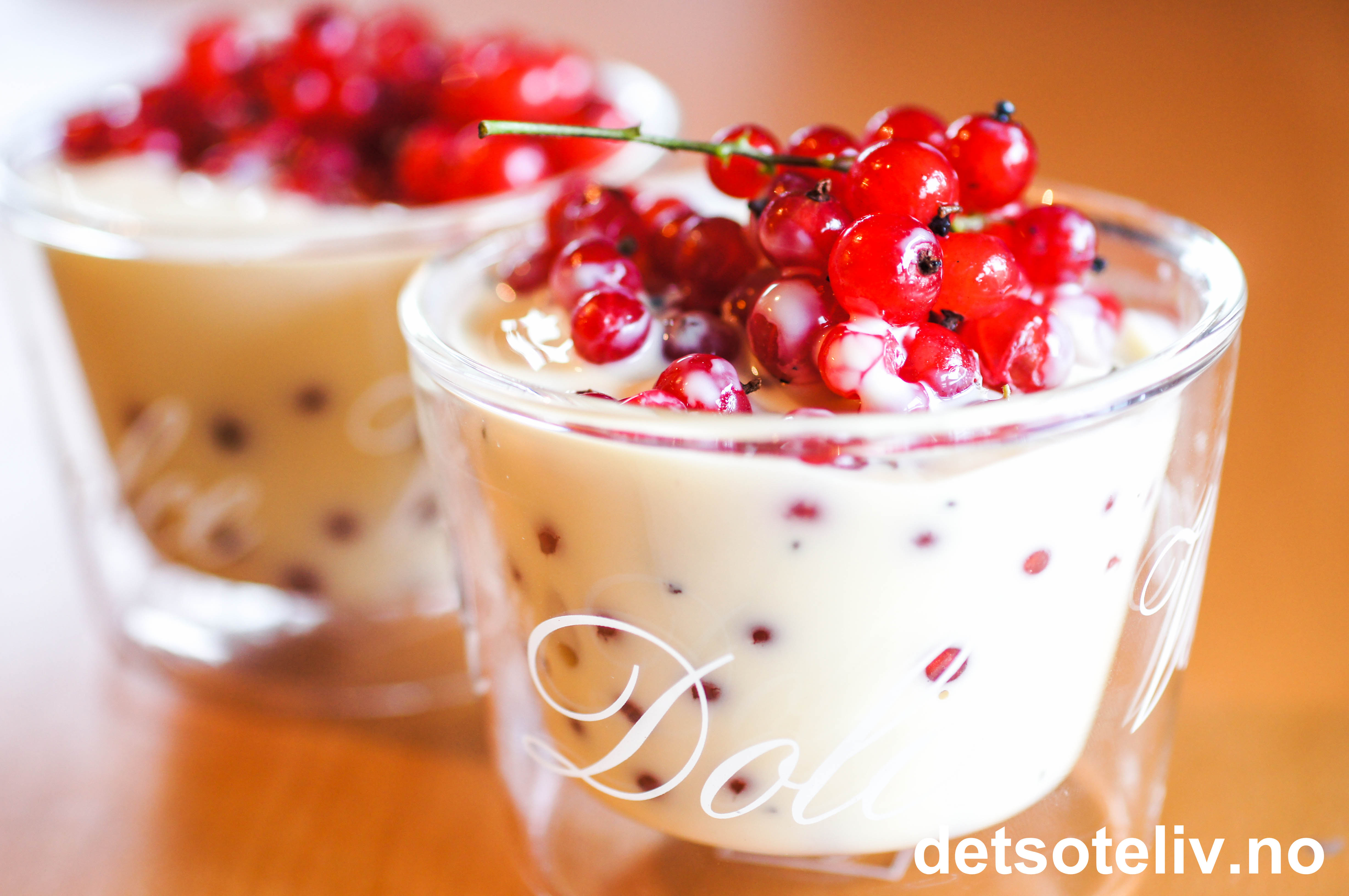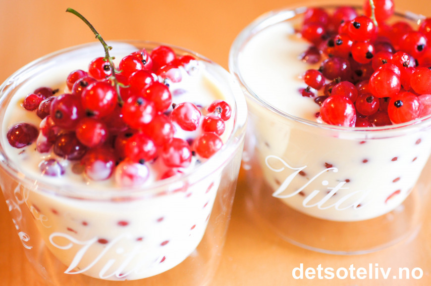 Avkjøl vaniljesausen før servering sammen med ripsen.