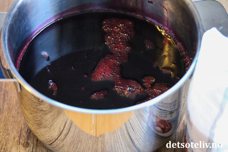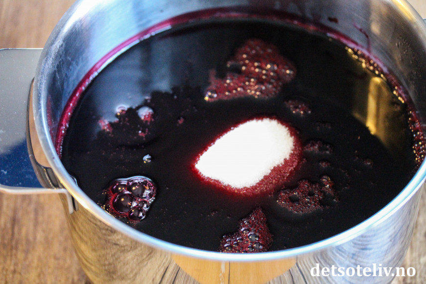 Varm opp saften til kokepunktet og tilsett ønsket mengde sukker. Mengden avhenger av type bær og personlig smak.