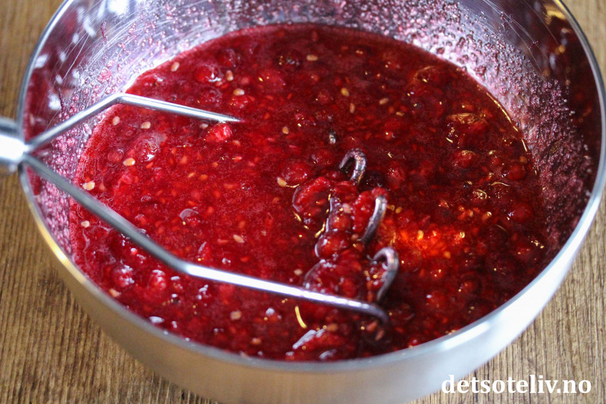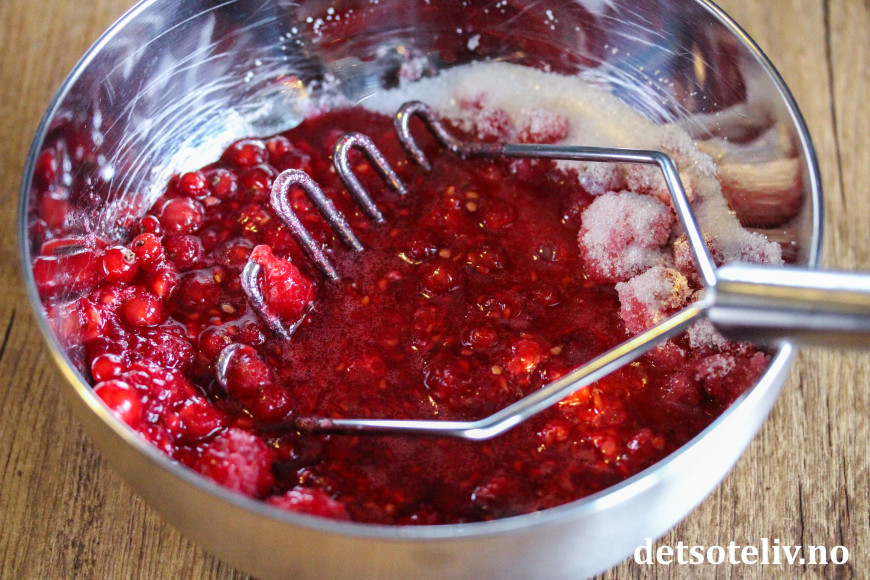 Rør eller mos alt godt sammen med en gaffel eller sleiv så bærene knuser og sukkeret løser seg opp.