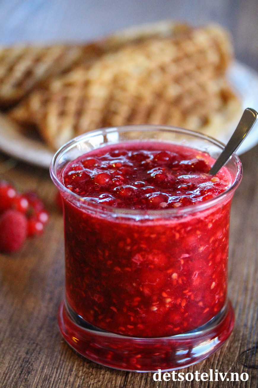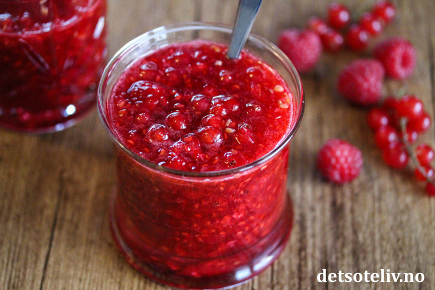 Rips- og bringebærsyltetøy lager du superraskt ved å røre sammen rips, bringebær og sukker - dette er like enkelt som å lage Rørt bringebærsyltetøy, Rørte bær og Rørte jordbær.
