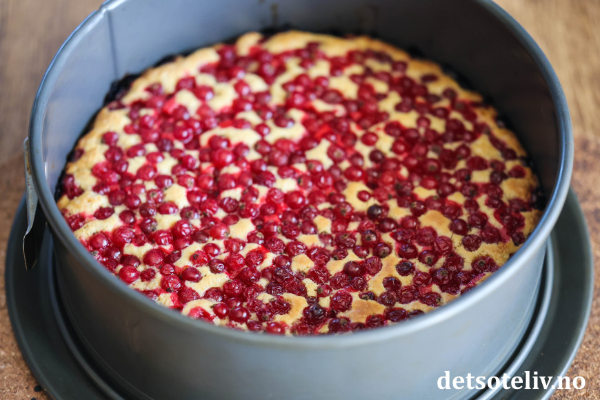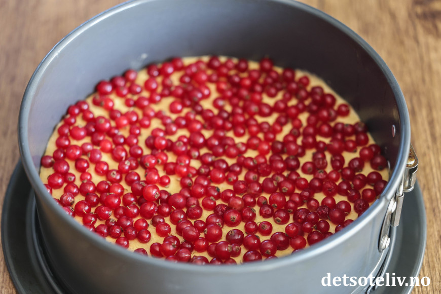 Fordel ripsbærene over deigen i formen (frosne rips trenger ikke å tines først).