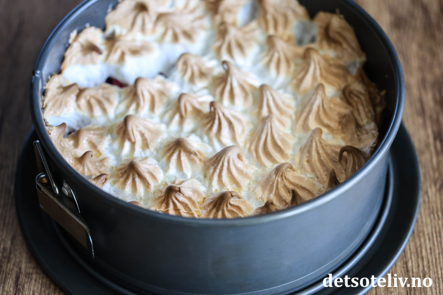 Sett kaken tilbake midt i ovnen, og stek den videre ved 200°C i ca. 15 minutter til, eller til marengsen ser gyllen ut på toppen.