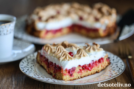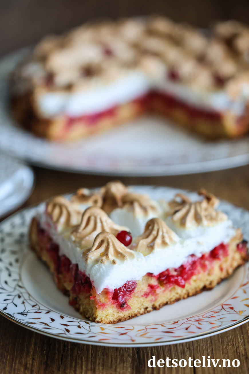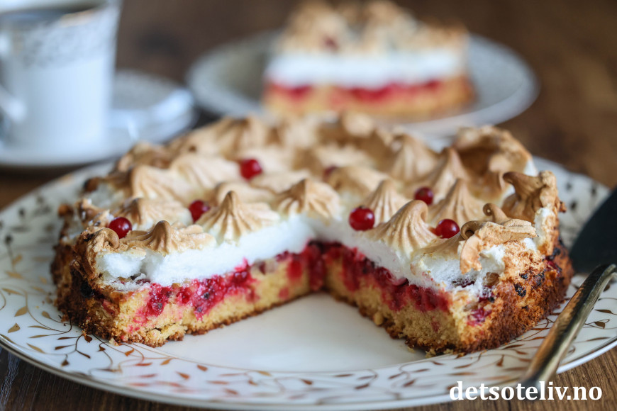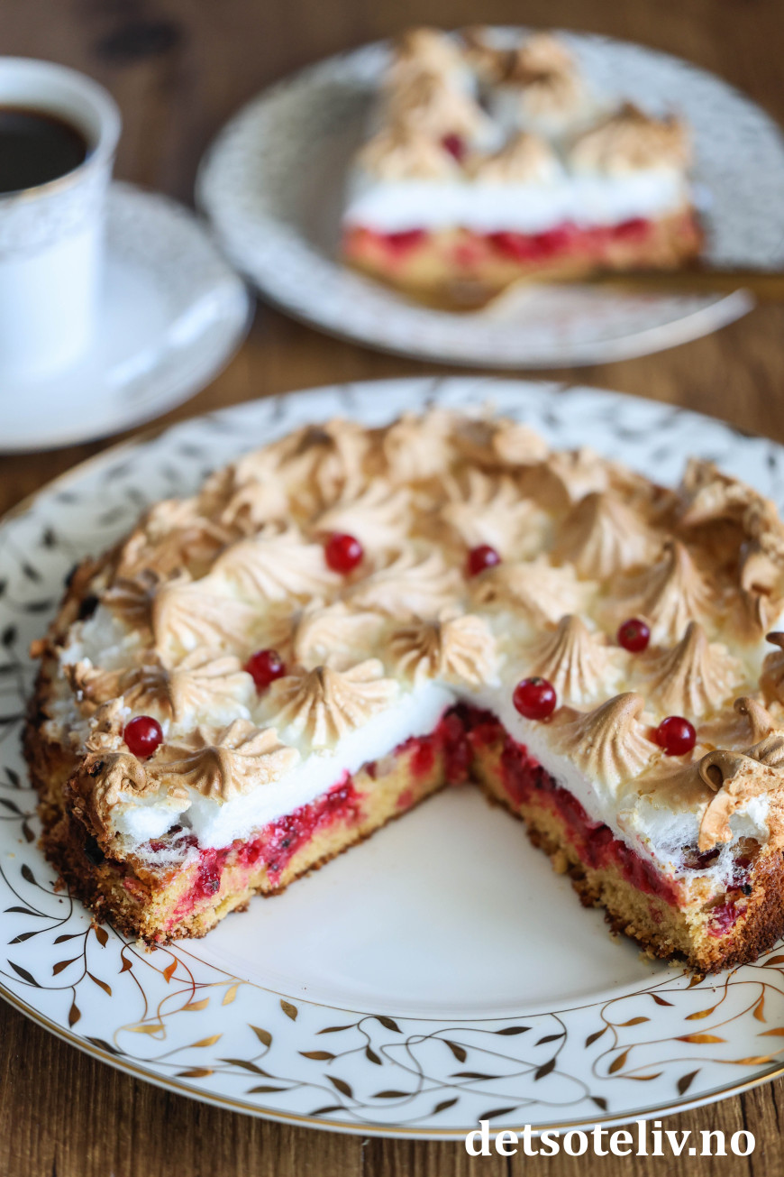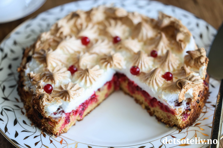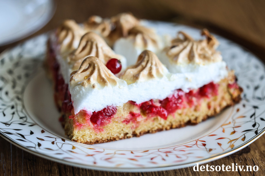 Dette er en lettvint kake som er rask å lage, men som likevel ser dekorativ og lekker ut. Den søte kakebunnen og marengstoppingen er perfekt sammen med ripsbærene.