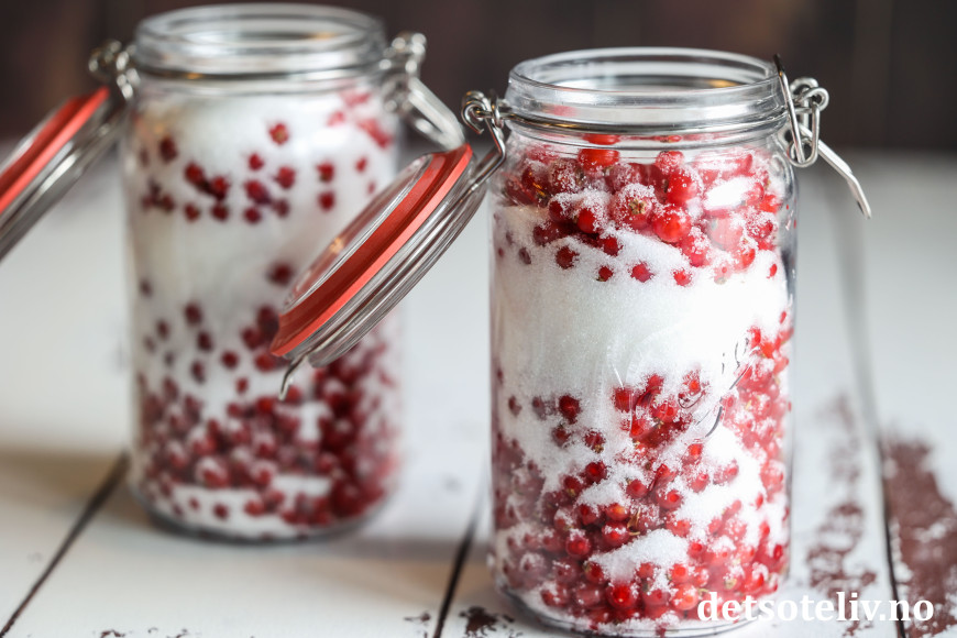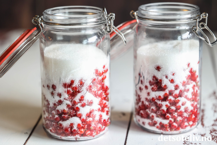Fyll rent glass som rommer 1 liter med rips og sukker. Rist litt på glasset slik at sukkeret synker nedover og legger seg mellom ripsbærene i glasset.